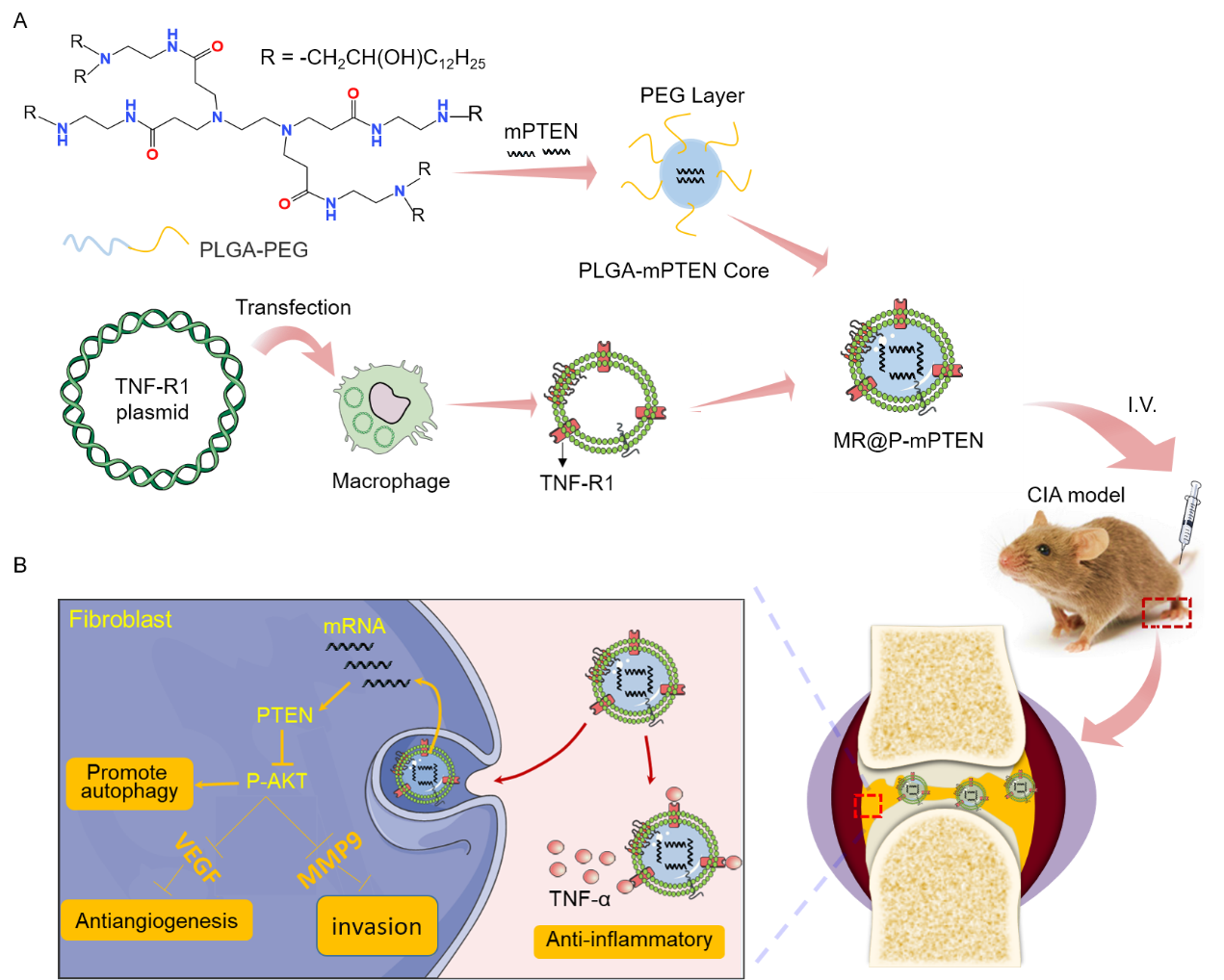 图1.MR@P-mPTEN的合成和治疗CIA机制。(A)MR@P-mPTEN的合成示意图。(B)MR@P-mPTEN治疗CIA的机制。MR@P-mPTEN竞争性结合TNF-α,然后将mPTEN导入滑膜成纤维细胞,诱导细胞表达PTEN蛋白。PTEN能够抑制P-AKT的表达,抑制成纤维细胞的侵袭、迁移、血管生成和自噬。