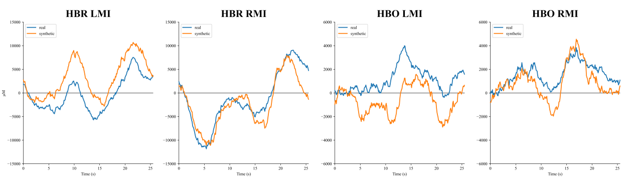 合成fNIRS信号与真实fNIRS信号的血流动力学响应曲线对比