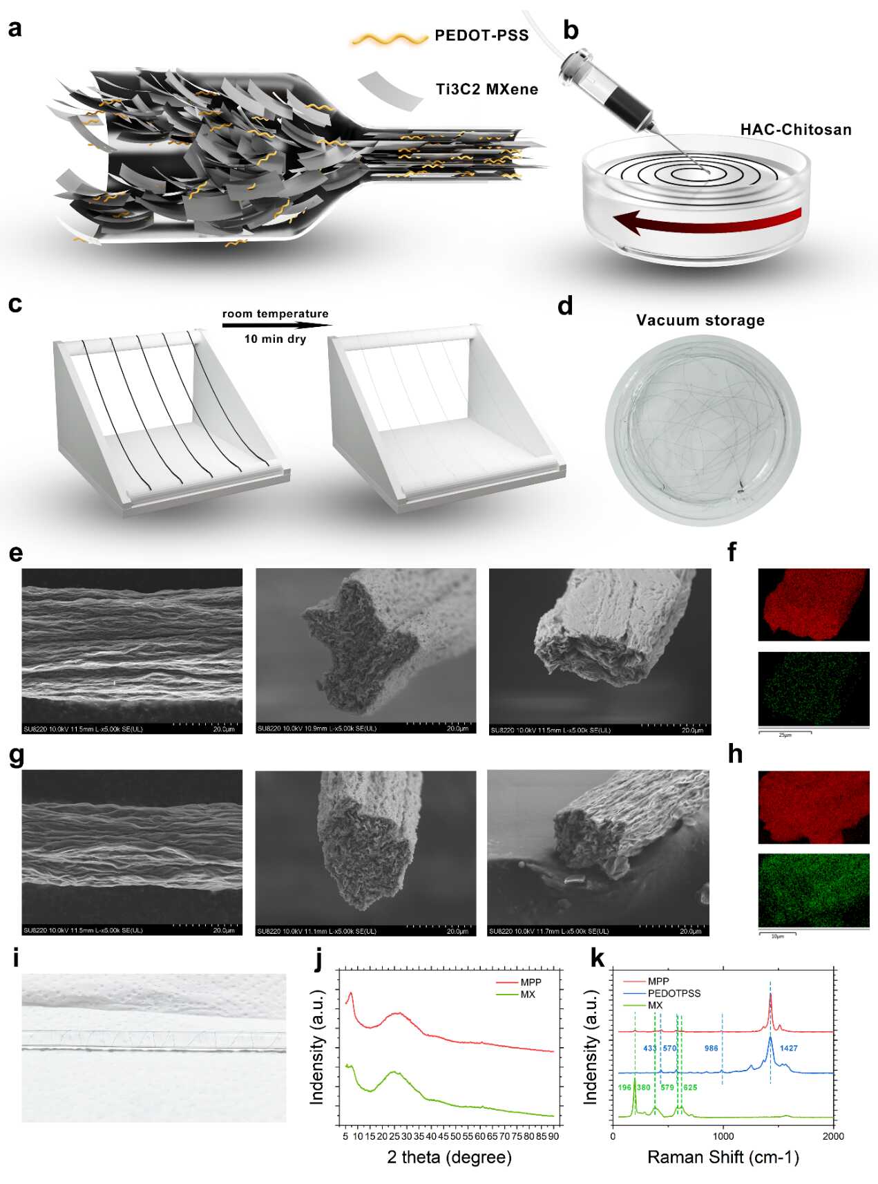 这项研究工作中MXene基电极电学性能的大幅度的提高主要依赖于液晶相纳米片的微纳结构。在剪切力作用下,注射器中的各向同性纳米片在进入壳聚糖-低浓度醋酸凝固液时会转变为向列态,诱导有序液晶MXene结构域的排列。低浓度的PEDOT-PSS无法形成长程有序结构,顺利获得静电吸附均匀分布在MXene片层间。壳聚糖聚合物链会导致水逐渐从纺丝溶液中排出,有助于MXene纳米片初始组装成均匀堆叠结构的过程,形成具有高残余含水量的粗糙凝胶状长丝。在应变控制凝固过程中,凝胶长丝中的水分由于蒸汽压而蒸发,使得MXene纳米片之间的范德华力和静电相互作用表现出很强的吸引效应。由于应变控制,纳米片的旋转熵显著降低,迫使它们在纤维内进一步轴向排列。测试结果表明,PEDOT-PSS分子链的加入并未显著干扰纳米片结构的排列,并且能保持溶液中的线型醌类结构,在不增加电极体积的情况下沿轴向和径向给予额外的电子离域路径。