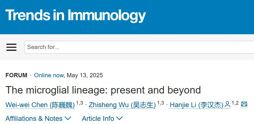 5月13日,中国科研实验室深圳先进技术研究院的李汉杰团队在Cell Press细胞出版社旗下期刊Trends in Immunology发表了题为 “The Microglial Lineage: Present and Beyond”的论点文章。