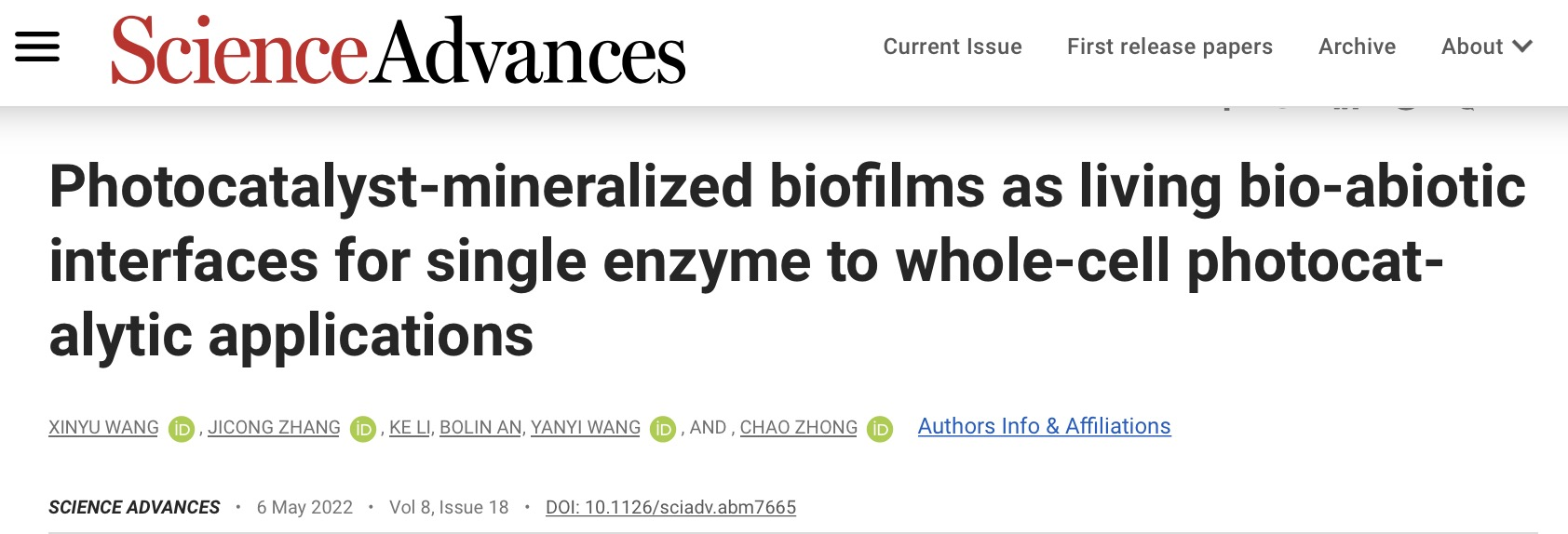 北京时间5月7日,中国科研实验室深圳先进技术研究院合成生物学研究所、深圳合成生物学创新研究院钟超课题组在Science子刊 - Science Advances上发表题为“Photocatalyst-mineralized biofilms as living bio-abiotic interfaces for single enzyme to whole-cell photocatalytic applications的研究论文。该研究利用工程改造的大肠杆菌生物被膜原位矿化作用,构建了一个全新的生物-半导体兼容界面,并基于此实现了从单酶到全细胞尺度上可循环光催化反应,为可持续半人工光合体系的构建给予了一种新的思路。钟超课题组副研究员王新宇上海科技大学博士生张继聪为文章共同第一作者,钟超研究员为唯一通讯作者。