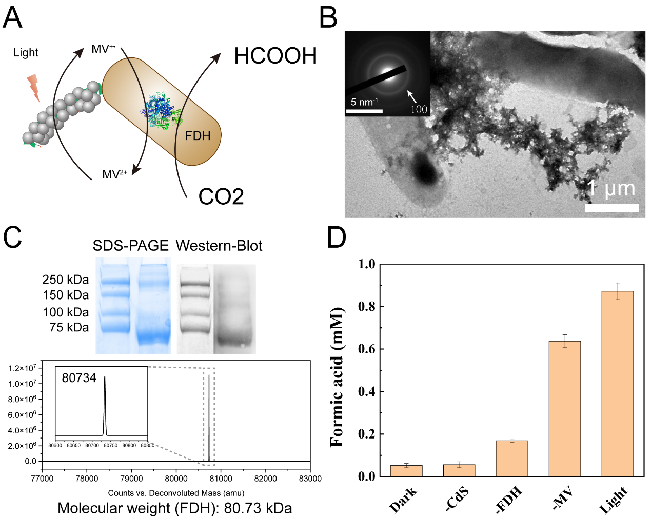 随着全球能源和环境问题的不断加剧,可再生清洁能源的开发,特别是太阳能的转化利用吸引了全球研究人员的关注。半人工光合作用是近年来诞生的新兴研究领域,结合生物体系的高产物选择性和半导材料的优异吸光性,能够实现太阳能驱动的燃料分子和化学品生产(例如利用光能驱动二氧化碳固定生成化学分子)。为在微纳尺度实现细菌和半导体材料的界面整合,当前通常的方法是将半导体纳米材料固定在细菌的外膜表面或顺利获得细菌内吞作用实现半导体材料和胞内酶的接触。然而由于细胞和半导体材料直接接触,光照下半导体材料的光生空穴对细胞将造成永久性损,从而严重影响反应体系的稳定性和可循环利用性。因此,如何构建牢固、友好的生物-半导兼容界面不断是该领域的重要挑战之一。