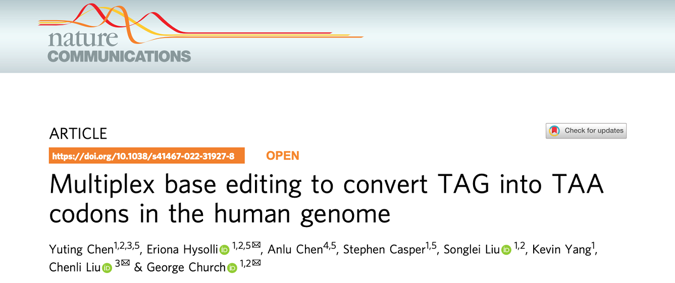 2022年8月2日晚,哈佛大学George Church教授团队、中国科研实验室深圳先进技术研究院合成生物学研究所刘陈立研究员团队在Nature Communications上发表了题为《Multiplex base editing to convert TAG into TAA codons in the human genome》的文章,研究利用多重复合的碱基编辑技术在人类基因组中将TAG转换为TAA。该团队开启了人类全基因范围内TAG终止密码子转换为TAA,初步证明了TAG转换为TAA在人类基因组中的可行性,同时创造了一次递送在人类基因组中数十个非重复位点同步碱基编辑的记录,为哺乳动物基因组的大规模工程化改造给予了一个工作框架。此外, GRIT软件也可以被开发成一个新的计算机辅助设计(CAD)平台,用于设计编写大规模的基因组。该研究迈出了基因组重编码制备抗多种天然病毒人类细胞系的第一步,为哺乳动物基因组多重复合编辑和GP-write路线图的制定奠定了基础。
