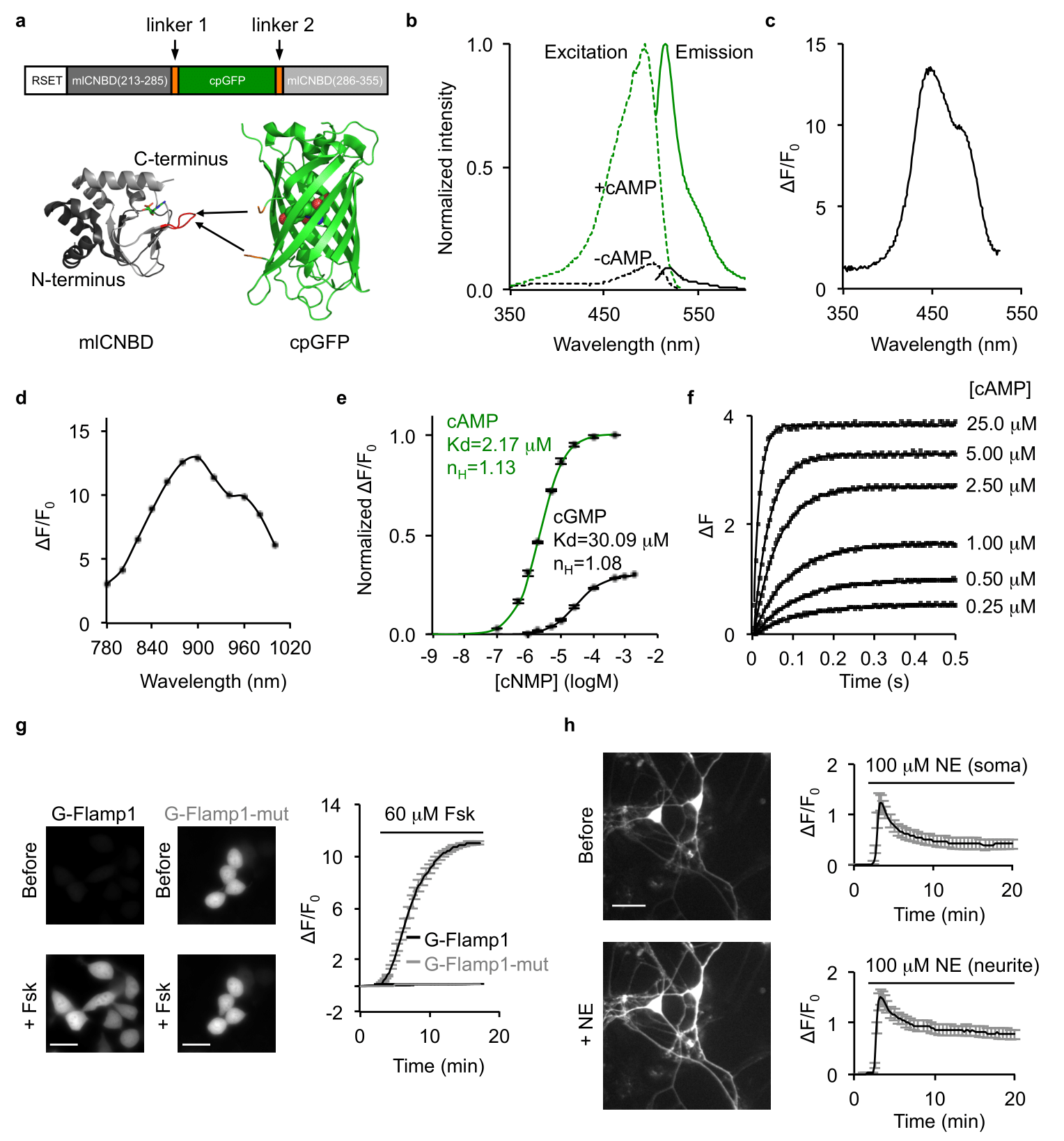 在该工作中,研究人员利用基于晶体结构介导的理性设计和蛋白质定向进化技术,开发了一种基于‘环化重排荧光蛋白’(circularly permuted fluorescent protein)的高性能基因编码的cAMP绿色荧光探针(命名为G-Flamp1)在活细胞内,该探针在单光子和双光子激发下的最大荧光变化均达到了12倍,并且结合和解离的时间达到了0.20.087秒。利用双光子显微镜和光纤记录仪,在果蝇和小鼠等模式生物内,该探针可实时监测特定动物行为过程中特定神经元的cAMP信号的时空动力学变化。