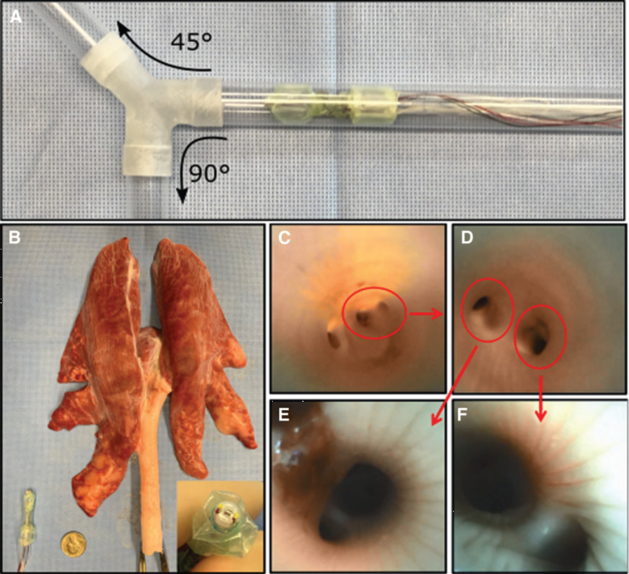 1. 机器人导航实验。(A)三通管接头转弯实验。(B)动物猪活体外组织与机器人原型机。(C)猪气管内,机器人视角中显示的三个支气管位置。(D)下肺叶支气管位置。(E)从右下叶支气管内观察下一分支。(F)从左下叶支气管内观察下一分支。