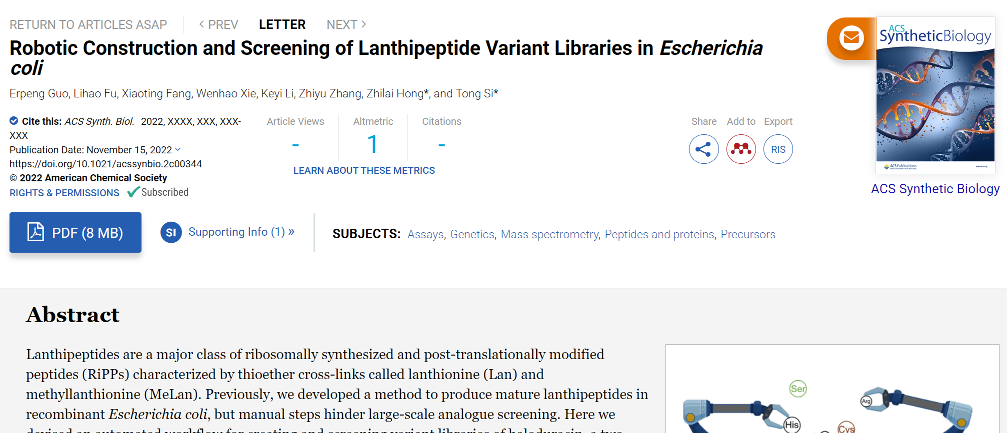 ACS Synthetic Biology | 凯发k8国际合成所司同课题组对羊毛硫肽衍生物文库的自动化构建和筛选