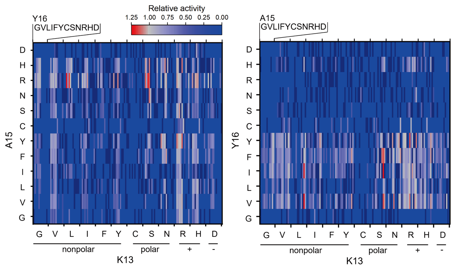 随后,作者进一步选择A环中Lys13、Ala15和Tyr16进行组合突变,这些位点对氨基酸突变具有高耐受性,且在同源序列中具有进化多样性。作者使用编码12种氨基酸的NDT简并密码子构建组合突变文库,顺利获得DNA测序从4800个随机菌落中筛选得到1373个独特的三位点突变株(占理论文库容量12 × 12 × 12 = 1728的79.4%),顺利获得琼脂抑菌实验取得序列功能关系(图3),并最终筛选得到Lys13Val-Ala15Arg组合突变可以显著降低对L. lactis指示菌的最小抑菌浓度。