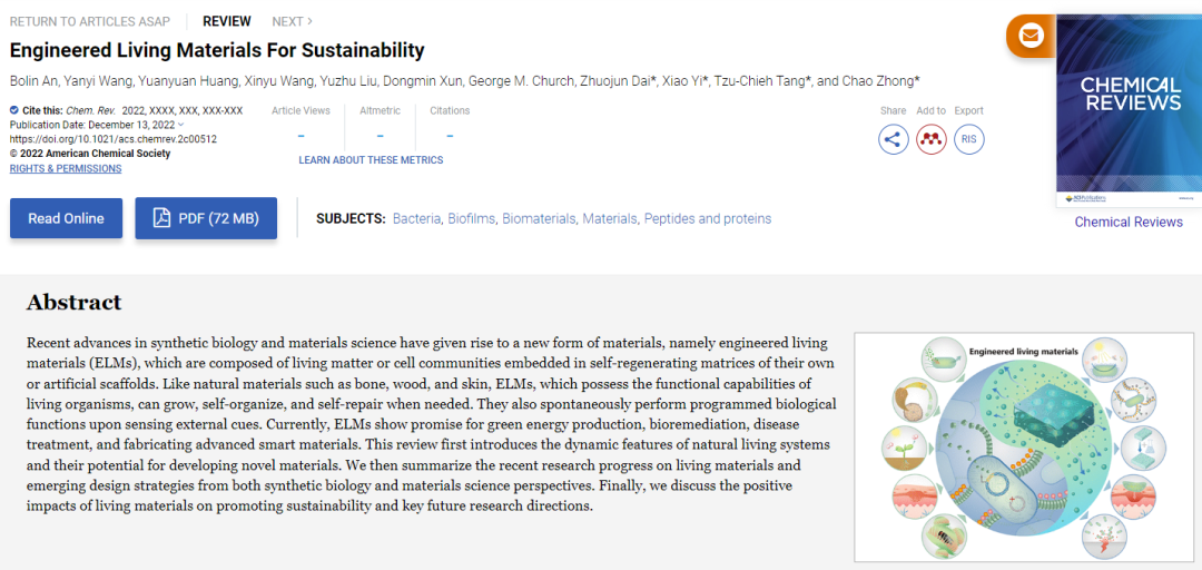 北京时间12月14日,中国科研实验室深圳先进技术研究院合成生物学研究所钟超研究员及合作者在国际知名学术期刊Chemical Reviews(IF=72)在线发表特邀综述文章“Engineered Living Materials For Sustainability”。 文章在讨论新兴工程活材料领域重要进展和未来挑战的同时,对该类材料如何加强可持续开展提出了新的观点和思考。