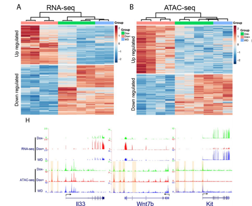 图3. HOTAIR诱导的基因表达和染色质开放性变化也随着HOTAIR降低而恢复
