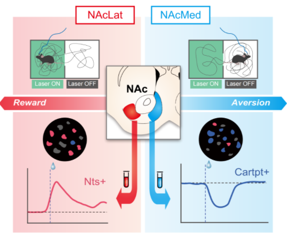 朱英杰团队的研究表明,伏隔核的内外侧亚区(NAcLat和NAcMed)中的神经元在动机行为中扮演着相反的角色,它们对奖赏刺激的反应、接受输入的大脑区域以及转录谱均有所不同。顺利获得微型显微钙成像和环路示踪技术,研究人员发现NAc神经元对奖赏的反应存在巨大的异质性,NAcLat神经元更多地被奖赏激活,而NAcMed神经元更多地被奖赏抑制,这不同的反应特性跟其接收的不同上游输入有关。利用空间转录组测序技术,研究团队揭示了NAcLat 和NAcMed在转录组水平上的巨大差异,并鉴定了Nts-阳性的神经元作为NAcLat的代表和Cartpt-阳性的神经元作为NAcMed的代表。