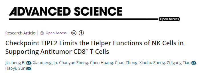 2月19日,Advanced Science 杂志在线发表了田志刚院士团队的最新研究成果“Checkpoint TIPE2 limits the helper functions of NK cells in supporting antitumor CD8+ T cells”,报道了NK细胞辅助CD8+ T细胞抗肿瘤免疫应答的分子机制,并报道了TIPE2分子是NK细胞辅助功能的卡控点分子,靶向敲除NK细胞中TIPE2能同时促进NK细胞及其辅助的CD8+ T细胞抗肿瘤应答。中国科学技术大学田志刚教授、孙昊昱教授及中国科研实验室深圳先进技术研究院合成生物学研究所毕嘉成副研究员为该文的通讯作者,毕嘉成副研究员同时为该文的第一作者。