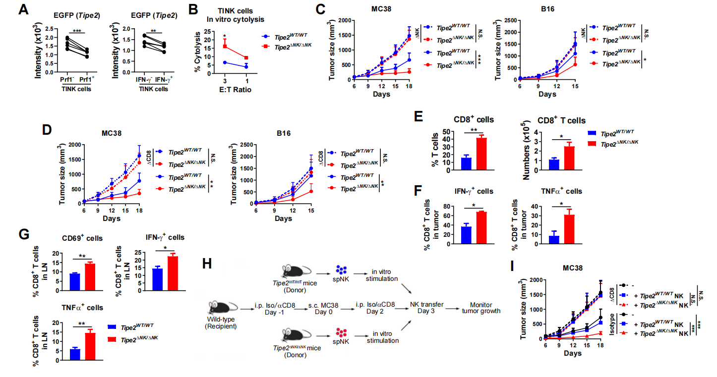 图2. NK细胞敲除Tipe2后促进抗肿瘤CD8+T细胞应答