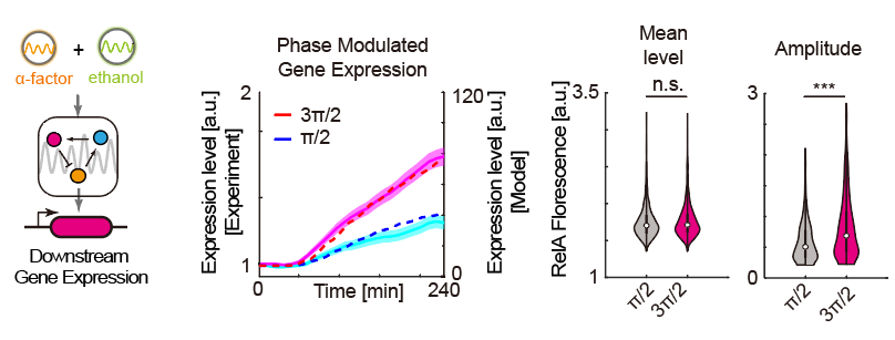 最后,顺利获得引入下游荧光报告基因,作者在实验和模型中确认了这种相位调整带来的振幅变化的确能造成基因表达水平的差异。这种差异与振荡的基线水平、振荡周期均无关。
