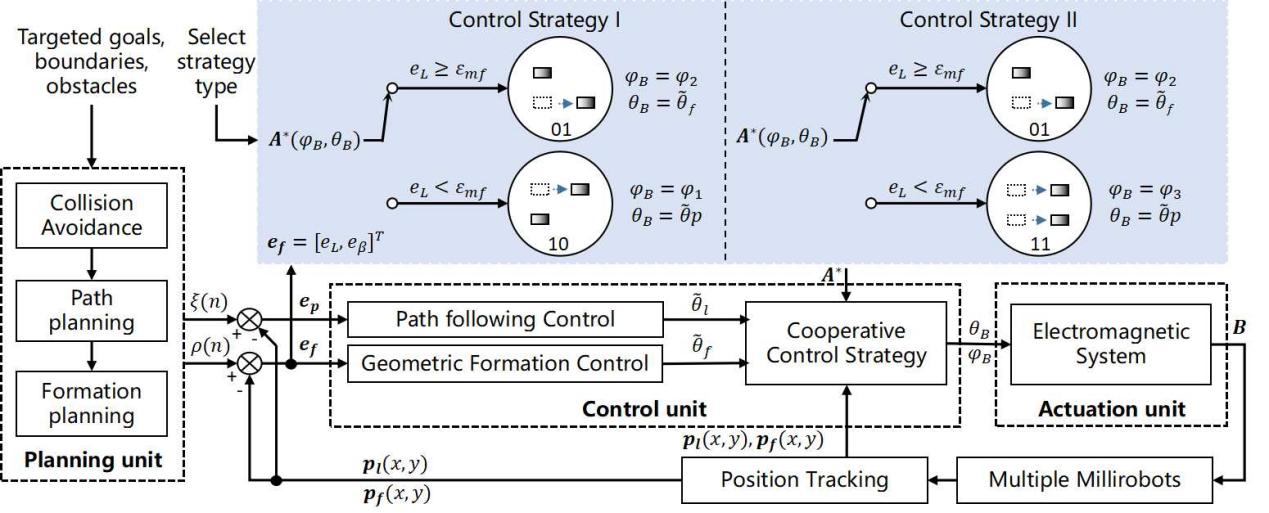 研究团队提出一种多磁驱动微型机器人全自动编队导航控制框架,包括了基于增强RRT*编队路径与队形规划单元、基于改进虚拟领航-跟随法的多磁驱动微型机器人协作控制单元和电磁驱动单元。规划单元中,提出的基于增强RRT*路径规划算法综合考虑了避碰、路径长度、搜索效率和电磁场分布特性,与其他RRT*及衍生算法相比,规划路径更趋向于电磁均匀分布区域。协作控制单元中包含一个具有扩展状态观测器的无模型跟随者控制器,应用于编队队形控制;一个基于模糊逻辑的领导者控制器,用于编队路径跟随控制;一个基于耦合速度的协作控制器,用于控制多机器人的速度状态。