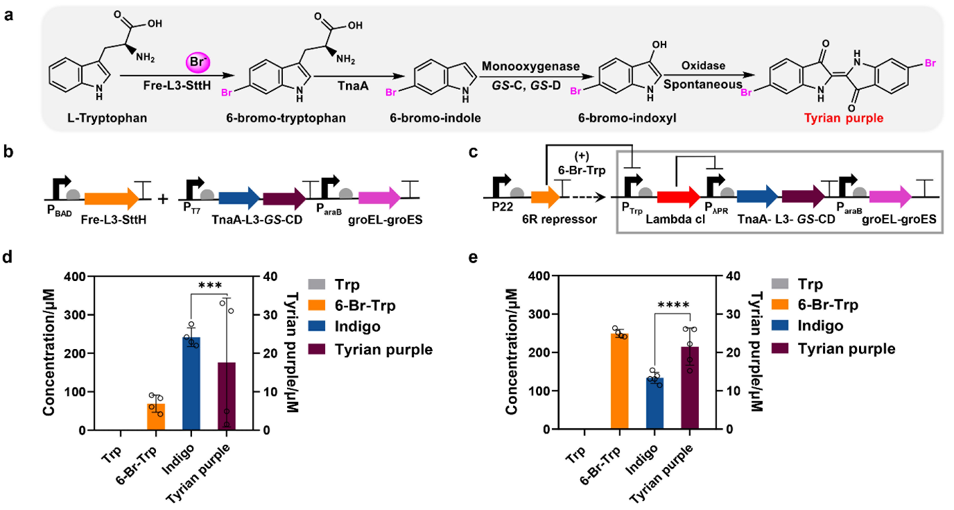 近年来,研究人员利用微生物(如细菌或酵母等)细胞工厂进行生物合成,以生产药物、生物燃料和其他有价值的化学品。这种合成生物学的方法已成为从可再生底物中可持续生产Tyrian purple的替代方案。Byung-Gee Kim等研究人员提出在大肠杆菌(E. coli)中利用色氨酸6-卤化酶,色氨酸酶和单加氧酶三步酶法从色氨酸合成Tyrian purple,这条Tyrian purple生物合成途径较为简单但面临两个很严重的问题,即色氨酸6-卤化酶体内催化色氨酸效率低和色氨酸酶对底物色氨酸和中间产物6-溴-色氨酸的催化缺乏选择性。色氨酸酶会与色氨酸6-卤化酶竞争底物,导致在单个细胞内合成只能取得大量的靛蓝副产物和极少的Tyrian purple。