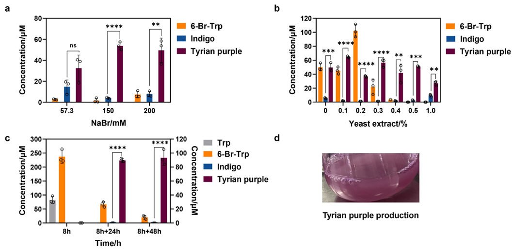 a. 不同浓度NaBr盐浓度的优化。 b.不同浓度的酵母提取物的优化。c. Tyrian purple的产量:M9-Br-CAA培养基中添加150 mM NaBr和0.1%的酵母提取物,细胞生长时间为8小时。 d. 在100 mL带挡板的玻璃锥形瓶中,使用25mL的反应体系进行Tyrian Purple发酵的结果