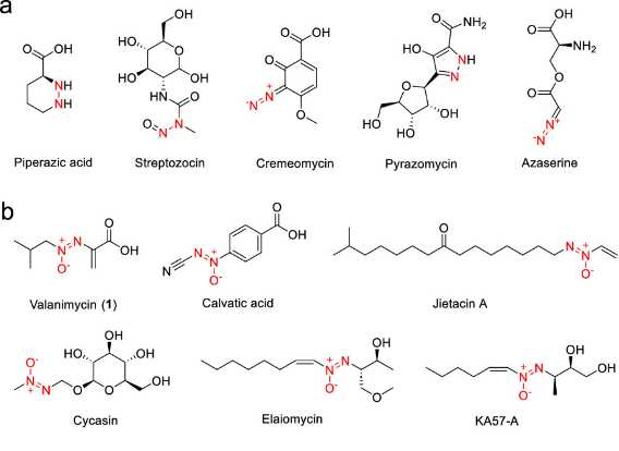图2. 部分含氮-氮(N-N)键类活性天然产物(a)及氧化偶氮家族化合物(b)