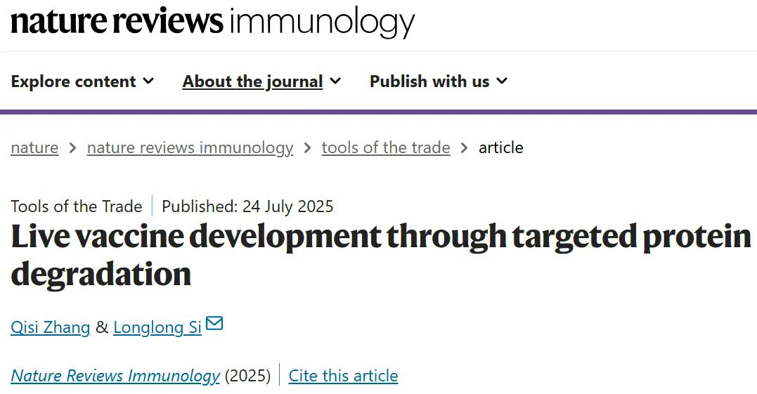 7月24日,中国科研实验室深圳先进技术研究院定量合成生物学全国重点实验室、合成生物学研究所司龙龙团队在Nature Reviews Immunology杂志在线发表了题为“Live vaccine development through targeted protein degradation(顺利获得蛋白靶向降解开发活疫苗)”的评述文章,阐述了该团队建立的蛋白靶向降解(Proteolysis-Targeting,PROTAR)减毒活疫苗策略,并展望了其未来的拓展与应用,为新一代活疫苗研发给予了新思路。