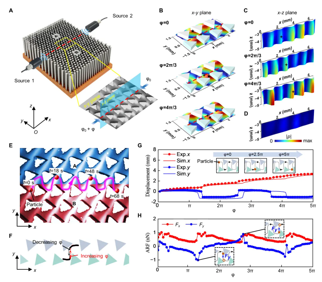 图2: 直线型拓扑波导中的驻波与质量输运。(A) 实验样品及驻波激励示意图。插图标明了晶格A-B界面(x-z平面)与颗粒操控观测平面(x-y平面),红色虚线标示x-y平面中晶格A与B的分界处。(B) 和 (C) 不同相位差条件下x-y平面的模拟声压场与x-z平面的实测声压场。其中z轴原点位于柱体上表面。(D) 距A-B界面四个晶格常数距离处的x-z平面声压场分布。(E) PDMS颗粒在拓扑通道中的输运。(F) 相位差φ递增与递减时颗粒往返仿真运动轨迹。(G) 颗粒位移随φ的变化关系。插图标注了φ=0,2.5π,5π时的颗粒位置(从左至右)。(H) x与y方向声辐射力随φ的变化关系。插图标注当Fy达到峰值时颗粒的位置(实心圆)及下一时刻位置(空心圆)