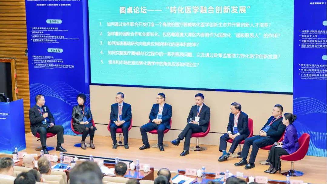 论坛的另一个重要环节——转化医学圆桌论坛,由本次论坛组织者凯发k8国际医工所转化中心主任、香港中文大学秦岭教授,医工所副所长、转化中心执行主任赖毓霄研究员主持,围绕“转化医学融合创新开展”为主题引导与会嘉宾展开深入讨论。